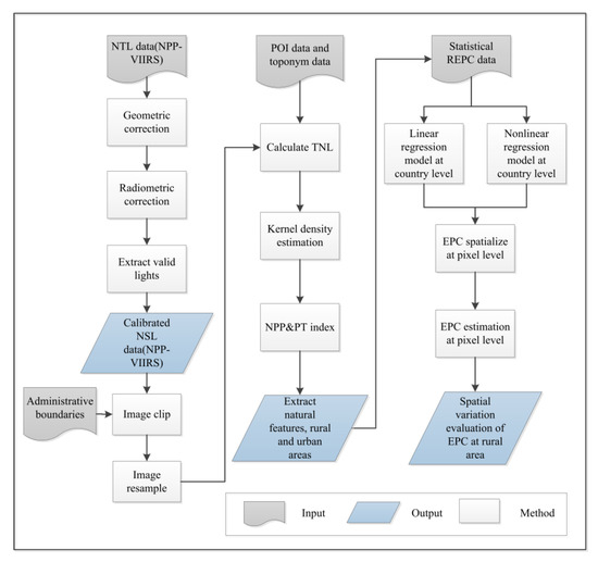 The remotely sensed NPP-VIIRS NTL data from 2012–2017 are used to estimate the REPC of the DH Prefecture based on the following four main procedures. First, the remotely sensed NPP-VIIRS NTL data are preprocessed to obtain night-time stable light (NSL). Second, the POI and toponym data are used to perform kernel density estimation, and then the study area can be divided into urban centers, rural areas and natural surfaces by combining kernel density estimation and the NSL data. Third, according to the boundaries of rural area, a regression analysis of electricity consumption and NSL from NPP-VIIRS is performed. Finally, the spatial estimation of EPC in the DH Prefecture is conducted according to the regression model (Figure 2).