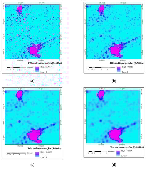In this study, through kernel density estimation with P&T data set in the study area, the aggregation degree of the POI and toponym data and the spatial distribution of the data density are calculated. The initial bandwidth R is set to 3000 m, and the output pixel size is one-tenth of the bandwidth (300 m). Then, the bandwidth and the output pixel size are continuously reduced to 300 m and 30 m, respectively. The kernel density estimation results are shown in Figure 4. By comparing the results of kernel density estimation, it is found that the region with the highest luminance value has an obvious boundary when the bandwidth R ranges from 800–1000 m, which is a suitable range for easily extracting the central boundaries of county-level urban areas. Therefore, the bandwidth R is set to 1000 m, and the output pixel size is set to 100 m in kernel density analysis to obtain the results. After obtaining the kernel density analysis results, the processed NSL data of NPP-VIIRS are re-sampled to 100 m, and the NPP & PT composite index values are then calculated by referring to the existing research [40] combined with the NSL data of NPP-VIIRS. The calculation equation is as follows: