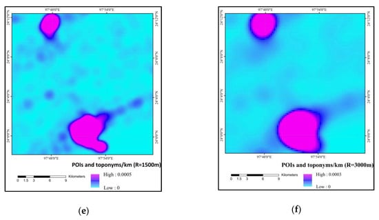 The results of kernel density estimation (KDE) at different bandwidths: (a) Results of KDE when the bandwidth is 300 m; (b) Results of KDE when the bandwidth is 500 m; (c) Results of KDE when the bandwidth is 800 m; (d) Results of KDE when the bandwidth is 1000 m; (e) Results of KDE when the bandwidth is 1500 m; (f) Results of KDE when the bandwidth is 3000 m.