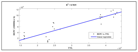where REPCn is the rural electric power consumption in administrative region n and TNLn is the total intensity of rural NTL in administrative region n. The regression results are shown in Figure 6.