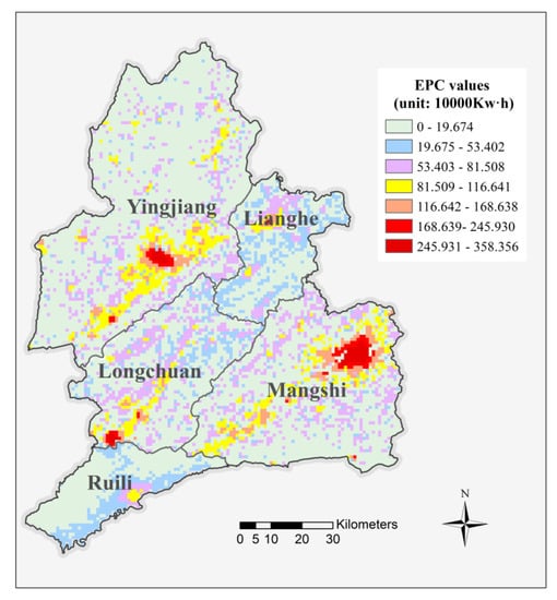 Using the methods described in Section 3, the EPC spatial results for five counties in the DH Prefecture in 2017 are obtained, and the results are divided into seven grades based on natural breaks (Figure 7).