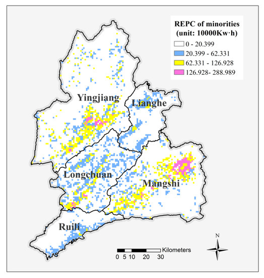 There are a large number of ethnic minorities in the DH Prefecture, and most of them live in rural areas outside the cities. Through the spatial analysis of the existing population census data of ethnic minorities in the DH Prefecture and the selected toponym data of ethnic minorities, we can get two kinds of proportion: proportion of ethnic minority population in each region and the proportion of ethnic minority toponym. Both of them reflect the distribution and amount of ethnic minorities in the DH Prefecture. Then, according to these two kinds of proportion and the spatial results of DH REPC, we can calculate the results of rural minority power consumption in the DH Prefecture. Finally, the ethnic REPC results of the DH Prefecture are reclassified into four levels: high consumption level, less high consumption level, medium consumption level and low consumption level. The results reflect the spatial distribution and power consumption levels of ethnic minorities in DH Prefecture (Figure 9). It can be seen from Figure 9 that the REPC of ethnic minorities in DH Prefecture is mainly concentrated in Mangshi, Yingjiang and Longchuan, and most of them are at less high and medium consumption levels.