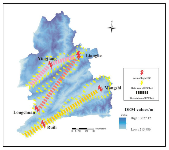 By comparing the EPC results in 2017 with the digital elevation map of DH (Figure 10), it can be found that most of the electricity consumption in the prefecture is concentrated in the valley basin areas. Moreover, by connecting the main power consumption centers and regions, we found there are three main EPC stripes in DH, the distribution of the three power consumption stripes is not only consistent with the topographical trend of the ridge and valley basin, but also consistent with the economic development of DH. Finally, according to the statistical results of REPC, the relatively high rural power consumption in Yingjiang and Mangshi may be due to the low elevations and the large areas of river valley in these regions. These features contribute to the human settlement and population growth. Through Figure 10, we can more accurately understand the overall distribution trend of DH’s power consumption, and provide reference for future economic development direction, urban and traffic construction.