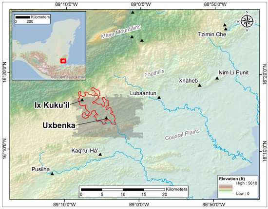 Uxbenká and Ix Kuku’il are in the southern foothills of the Maya Mountains of Belize. The Southern Belize foothills were home to several large polities including Uxbenká, Ix Kuku’il, Lubaantun, Xnaheb, Nim Li Punit, and Tzimin Che, some of which erected carved and dated stone monuments [53,54,55] (Figure 1). The topography of Southern Belize varies from mountain and foothill uplands, with elevations between 250 and 500 m above sea level, to flat coastal plains. The topography largely influenced the location of Classic Maya settlements, as most sites are situated on areas of hilly relief in the foothills of the Toledo Uplands [56], which comprise only 6% of the Southern Belize landscape [57] (p.169).