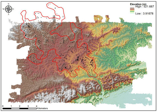 The UAP conducted pedestrian archaeological settlement survey at Uxbenká and Ix Kuku’il from 2005 to 2018 [50,51]. The efficiency of the survey drastically increased with the acquisition of lidar data in 2011 and the ability to target minor hilltops for survey [9,18]. The survey identified a total of 339 plazuelas, which are spatially discrete groupings of archaeological features, including house mounds or monumental architecture, situated around a central plaza and often on an isolated hilltop or knoll of a hill (Figure 2). Of these, 315 were located within the lidar dataset. The survey identified an additional 68 hilltops in the lidar area that lacked archaeological features, which provided a basis for assessing the visual appearance of hilltops without archaeological features. The UAP survey data were used to test the effectiveness of remotely sensed archaeological prospection for both confirmed positives where known plazuelas are located and false positives where pedestrian survey identified no archaeological features. Most of the previously documented archaeological features are composed of ancient house mounds rather than monumental architecture.