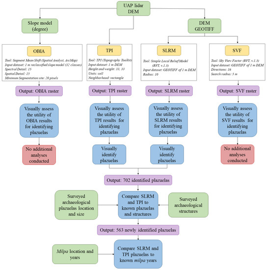 To test for the ideal parameters in the identification of archaeological features, I ran several iterations of each tool with different inputs (see Figure 3 for final inputs). After the raster images were created from the iterations of analyses, I selected the best raster image from each method for identifying archaeological sites. Like others (see Reference [64]), to improve the visual detection of archaeological features, I modified the color ramp display for each raster output. Then, I visually assessed each raster image for its utility to identify Maya plazuelas and house mounds. I visually examined un-surveyed areas and previously surveyed plazuelas, to determine which outputs were best for identifying new plazuelas.