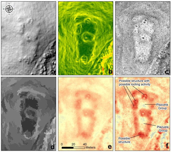 Relief visualization techniques used this this study, and the ability to visually detect archaeological features. This new identified plazuela is larger than most in the lidar dataset but nicely reflects the variations in visualizations for archaeological prospection (see Figure 5). (a) Hillshade: Modified (flattened) hilltops are difficult to detect, but some structures are visible. (b) Slope: The flattened hilltop is visible, as are some of the structures. (c) Sky-view factor (SVF): Flattened plazuelas and structures are difficult to detect, although potential looting activity stands out as dark spots on the image. (d) Object-based image analysis (OBIA): Flattened plazuelas are visually detectable, but structures are difficult to detect. (e) Topographic position index (TPI): Flattened plazuelas are visually detectable by the red circular/rectangular perimeter; structures are also visible. (f) Simple local relief model (SLRM): Plazuelas are easy to detect by the lighter plaza surrounded by a darker red perimeter suggestive of a flattened hilltop. Structures and possible looting activity are also easily visible. Plazuelas are most easily visually detectable on the SLRM and TPI images, compared to the OBIA and SVF images.