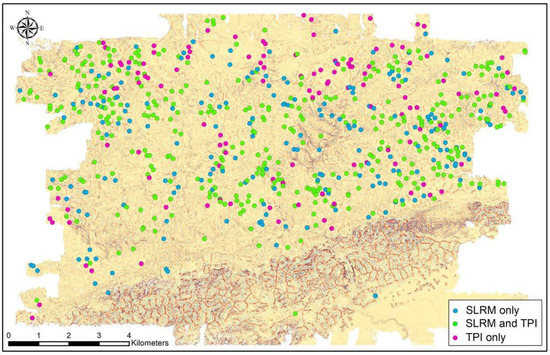 The location of plazuelas identified with both SLRM and TPI (green dots), only SLRM (blue dots), and only TPI (pink dots). The background is the TPI raster.