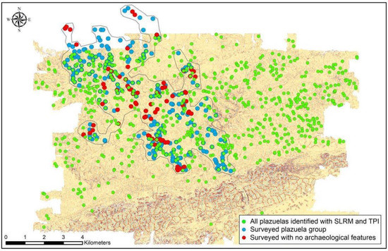 These results parallel the findings from the previous study that examined a 4 km2 subsample of the UAP lidar [9] but also indicate the advantages to using multiple relief visualization techniques. The previous 2015 study concluded that structures were difficult to detect on the bare earth hillshade and in the point cloud, and that hilltop modifications were most visible in the varied topography and vegetation [9]. Here, the SLRM and TPI outputs are useful for remotely identifying plazuelas; however, there is a bias for larger plazuelas and plazuelas with more structures.