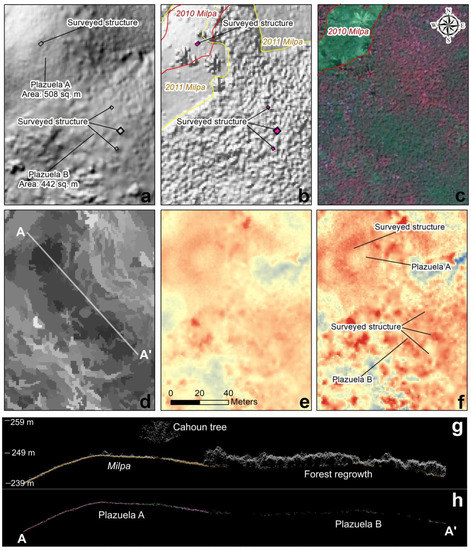 An example of the impact of vegetation on the relief visualization of small plazuelas from Uxbenká Settlement Group 83. (a) The location of structures and the location and size of Plazuelas A and B on a lidar hillshade DTM in comparison to (b) 2011 milpas and forest areas on the lidar DSM. (c) A 2010 milpa is visible on the GeoEye-1 false color infrared (FCIR) satellite image acquired in 2010. The plazuela in the 2011 milpa is easier to identify on (d) OBIA, (e) TPI, and (f) SLRM, compared to the plazuela within the forested area. Point cloud profiles with (g) all returns (filter: classification; gray = unclassified (vegetation); orange = ground) and (h) ground returns (filter: elevation) showing that areas with forest regrowth often have fewer ground return points.