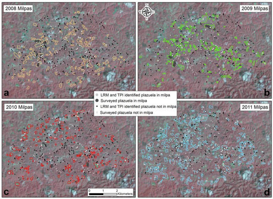 Surveyed, SLRM, and TPI plazuelas identified within milpas from 2008 to 2011 (see Reference [9]). (* Note: One SLRM and TPI plazuela identified within the milpa boundary is a false positive).