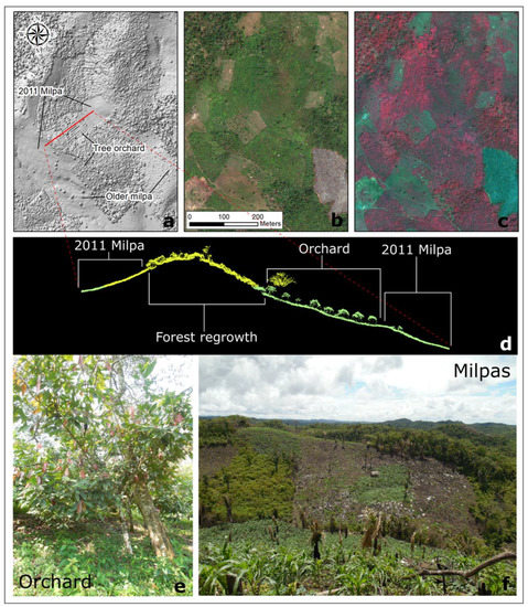 Vegetation height and density varies based on land use practices. Previous studies observed that vegetation type and height across the landscape has a direct impact on the visibility of archaeological remains [6,9,35,41,62,78]. Modern Maya populations in Southern Belize practice slash-and-burn (swidden) agriculture resulting in a mosaicked patchwork of forest re-growth [9,79,80]. Previously, using a combination of a false color infrared (FCIR) GeoEye-1 multispectral satellite imagery to pinpoint color variations among patches of vegetation regrowth, lidar Digital Surface Model (DSM) which reflects vegetation foliage, and LAS point clouds, milpas from 2008 to 2011 in a 40 km2 area within the UAP lidar dataset were mapped. These mapped milpas were used to test if vegetation growth (as a direct reflection of which year the land patch underwent milpa cultivation) influenced the visibility of archaeological remains using the SLRM and TPI model and comparing them to surveyed plazuelas.
