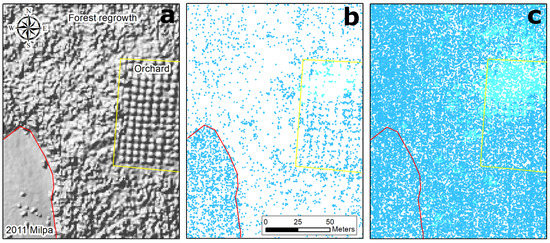 milpas cleared in spring 2011 had an average of 6.3 ground returns per m2. milpas cleared in 2010 to 2008 had decreasing ground returns due to the re-growth of tropical vegetation during fallow periods. In 2010 and 2009 milpas, ground returns were 3.9 and 3.3 returns per m2. In 2008 milpas, the average ground returns of 1.6 per m2 represented a nearly 75% reduction, as compared to 2011 milpas [9] (pp. 5–7). Recent milpas from 2009 to 2011 have higher average ground returns than milpas older than 2008 and the associated vegetation growth.