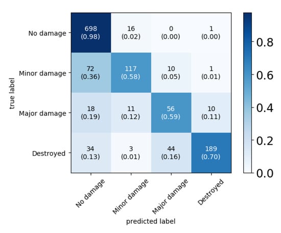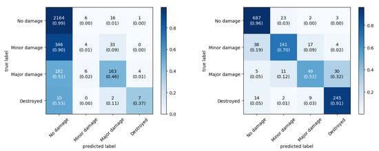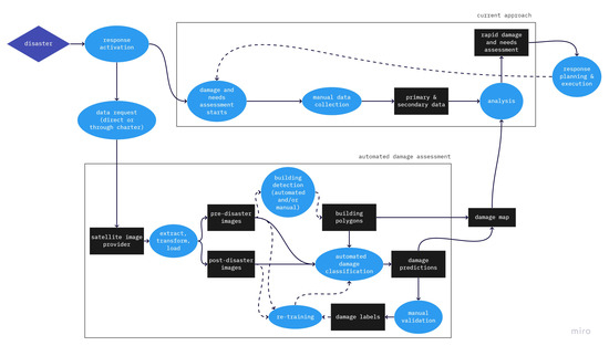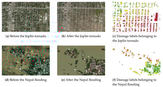Disasters caused by natural hazards affected 95 million people in 2019 alone and led to 140 billion USD in damage []. Providing adequate emergency response is increasingly challenging, especially in developing countries, due to the growing number of disasters and insufficient resources to provide humanitarian services []. High-quality information on the impact of disasters is essential []. It can be used in the immediate response phase to identify areas and people affected as well as in the mitigation phase to improve urban planning, for example. The impact of a disaster varies from tangible to intangible and from economic loss (such as of livelihoods in terms of crop and livestock) to physical damage to buildings and critical infrastructures. Different approaches, methodologies, and tools are used to collect impact data. Damage and needs assessments (DNAs) are systematic processes for determining the location, nature, and severity of the damage and they are usually done at various intervals from right after a disaster hits into the recovery phase [,,]. DNAs typically rely on field surveys, complemented in some cases by, for example, aerial imagery. Field surveys are costly, are time-consuming, and are typically only possible once the affected regions are accessible, causing a delay in their availability. Additionally, they cannot be updated easily and are of varying quality. Damage assessments using remotely sensed data are already often included in DNAs, if suitable imagery is available. These assessments are currently done manually, either by relief workers themselves or by specialized agencies such as UNOSAT. Different protocols for annotating damage in such images exist [,,], which unfortunately prevents the comparison of assessments across different disasters or even within the same disaster, when carried out by different agencies. Additionally, the quality of these assessments is not consistent and can be insufficient [], while their speed and scalability is limited (less than 100 buildings per hour per person).