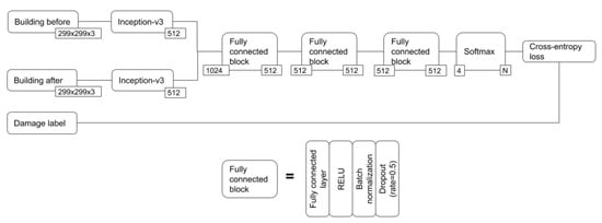 The before and after building images are given as input to two separate CNNs, which follow the Inception-v3 architecture []. Inception was chosen as the CNN architecture since it has a relatively low computational cost and works with different kernel sizes such that it can detect features of different sizes, and works well with inputs that represent different scales []. The input size of the Inception model is 299 × 299 pixels and since the whole architecture has to be modified if reducing the input size, it was chosen to re-scale all cropped building images to have a width and height of 299 pixels. The output feature vector of Inception-v3 has a size of 2048, but in our model this output vector was scaled down to have a size of 512. This lowering of the output dimension was done to prevent overfitting, since most original input images are smaller than 299 × 299 pixels and thus most information can be retrieved with a 512 feature vector. The weights of the Inception-v3 models were pre-trained on ImageNet [], since this has been shown to often improve the accuracy drastically [,]. The weights are re-trained on the disaster data during the training process.
