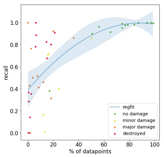 The first factor that could influence the performance is the difference in class distributions. Figure 9 displays the percentage of data points belonging to a class vs. the recall of that class for each disaster and each of the four classes. There was a monotonically increasing, roughly logarithmic, relation between the class distribution and the recall, revealing that the recall generally increased when a larger percentage of data points belonged to that class. Concurrently, not all data points followed this trend, especially in the major damage and destroyed classes.