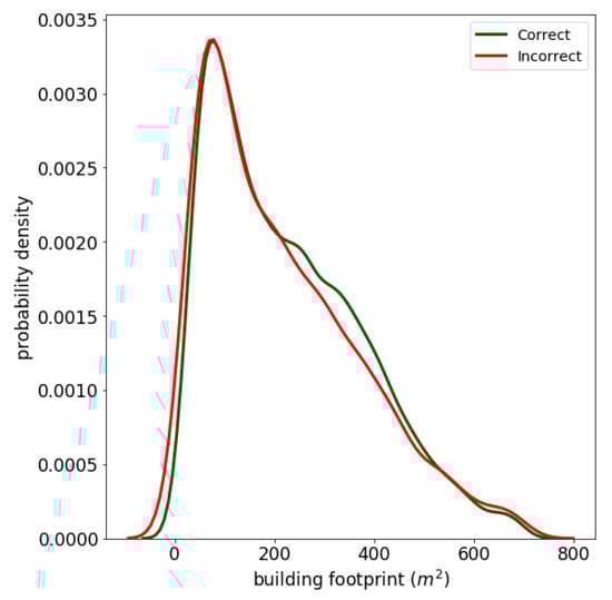 A second factor could be the building footprint, assuming buildings with smaller footprints are more difficult to classify due to fewer optical clues. Figure 10 shows the distributions over the building footprint for the correctly and incorrectly classified buildings, for the 95% percentile of buildings. The distributions of the building footprint over correctly and incorrectly classified buildings largely overlapped. This shows that a larger building size is not a predictor for the chance that a building will be correctly classified.