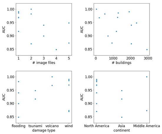 The third factor could be disaster-specific parameters, such as the number of satellite image pairs covering a disaster, the number of buildings, the type of disaster, and the geographical region where the disaster struck. A technique to understand the relation between these parameters and the performance is by making a scatter plot of the value of the parameter versus the performance metric. The AUC over the binarized labels destroyed and not destroyed was chosen as a performance metric, since this is the measure least influenced by class imbalance. Figure 11 shows the scatter plots for the four parameters. From these plots, it can be seen that there was no correlation between the AUC and any of the four parameters.