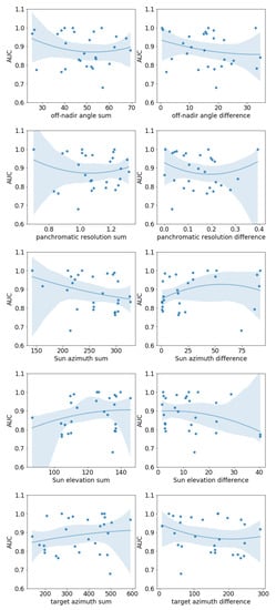 Lastly, we can inspect parameters that are specific for a pre- and post-disaster satellite image pairs. These include the off-nadir angle, panchromatic resolution, sun azimuth, sun elevation, and target azimuth. In Figure 12, scatterplots for these parameters versus the AUC are shown. For each parameter a scatter plot was made for the sum of the pre and post images of that parameter, and of the absolute difference between the pre and post images of that parameter. Again, we can see that none of the parameters had a very distinct relationship with the AUC. The largest influence seems to come from the sum of the Sun azimuth; the larger this sum, the smaller the AUC. This same relation is somewhat visible in the difference in sun elevation. Both these parameters have to do with lighting and thus it can be interpreted that too little/too much lighting or larger differences in lighting can degrade performance.