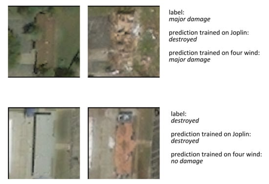 Both studies also applied fine-tuning as an experiment, meaning that they first train the model on a set of disasters and thereafter do the final training on a limited set of the test disaster. Xu et al. [] used 10% of the available buildings for the fine-tuning, whereas Nex et al. [] used between 15% and 25%. Both studies showed that fine-tuning improves performance in all setups. However, in most emergency response contexts having this percentage of labeled data of the test disaster is often not realistic due to time and resource constraints.