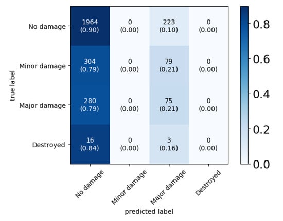Most studies worked with an imbalanced dataset with respect to the difference between the number of destroyed and not destroyed buildings [,,,], as shown in Table 1. The two studies that had a balanced dataset [,] prepared this on purpose by selecting solely a part of the original data, and the same was done, to a certain extent, by the other studies to diminish the imbalance. Such a selection is not possible during a real-time emergency response, and thus it is likely that in such a scenario the class imbalance is large. The effect of class imbalance is hard to assess from previous research. It could be argued that a larger imbalance improves performance when measured in terms of accuracy since the model tends to lean towards the majority class. To know if the model indeed shows this behavior, the performance of all classes should be analyzed separately. Only two studies reported this, and in both cases the model performed better on the majority class (not destroyed) than on the minority (destroyed) class [,], suggesting that a larger class imbalance can lead to better accuracy while not indicating a better predictive value.