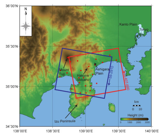 Map showing the area around Hakone Volcano. The topographical map is based on 50 m mesh height data released by the Geospatial Information Authority of Japan (GSI). The red and blue rectangles show the area included in the scenes of the ascending and descending orbits, respectively. Red points show the location of ground control points used for the analysis.