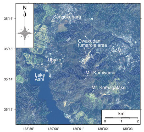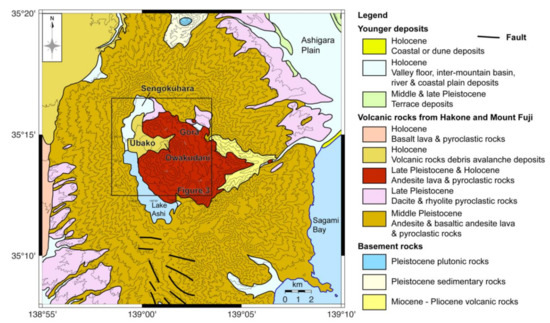 - Geological Society of Japan Eds. Geological leaflet 1 Hakone Volcano; Geological Society of Japan: Tokyo, Japan, 2007. (In Japanese) [Google Scholar]