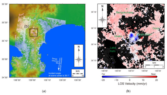 Figure 5 shows the analysis results obtained for the ascending orbit (observations from the western sky). The colors of the figures show the satellite line-of-sight (LOS) velocity; the positive values shown in red indicate the LOS velocity toward the satellite, while the negative values shown in blue indicate the LOS velocity away from the satellite. Since the LOS velocities are corrected by GNSS displacements, these are not relative, but absolute velocities. A LOS velocity of approximately 4 mm/year toward the satellite was observed over the entire area (Figure 5a). A maximum LOS velocity of about 23 mm/year away from the satellite was observed to the west of Owakudani (Figure 5b), the largest fumarole area in the Hakone Volcano.