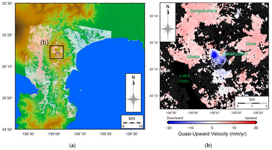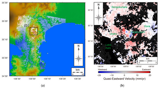 The quasi-eastward velocity shows that almost the entire area was displaced westward (Figure 7a). This westward displacement is considered to be a regional tectonic displacement caused by the Pacific Plate, which is subducting beneath the northeastern Japan [16,17]. On the other hand, the areas near Mount Fuji and Hakone Volcano showed eastward velocities (Figure 7a,b). Since expansions of volcanic edifices were observed by GNSS around Mount Fuji and Hakone Volcano during the study period [18,19], the eastward velocities might be consistent with the GNSS displacements.