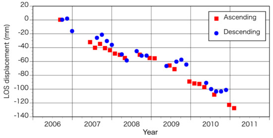 The ENVI+SARscape software program (Sarmap Sa, Caslano, Switzerland) was used for the SBAS-InSAR time series analysis in this study. Given that coherence is generally worse when the perpendicular baselines (Bperp) between ALOS/PALSAR orbits are more than 1000–1500 m, the analysis was conducted by extracting the interference pairs whose Bperp was less than approximately 1000 m. The pairs with weak interference were then removed visually, and 21 scenes-64 pairs in the ascending orbit and 21 scenes-57 pairs in the descending orbit were used for the analysis (Figure 4). Three of the scenes in the ascending orbit were excluded because of the large Bperp between the other scenes (Table 1). One of the scenes in the descending orbit was excluded because it was observed after the Tohoku-Oki Earthquake (M9.0) of 11 March 2011, and was affected by the earthquake displacement (Table 1).
