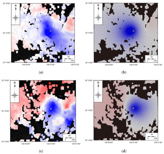 Results of the inversion analysis for estimating the point pressure source beneath the ground surface to the west of Owakudani: (a) observed velocity in the ascending orbit; (b) simulated velocity in the ascending orbit; (c) observed velocity in the descending orbit; (d) simulated velocity in the descending orbit. Contour lines in (a,c), in which intervals are 25 m, were extracted from 10 m mesh height data released by the GSI. The yellow “x” marks the location of the point pressure source, the parameters of which are shown in Table 2. Estimated offsets for the ascending and descending orbits are +0.15 and +2.43 mm/year, respectively. The color scales used for the velocity are the same as those in Figure 5 and Figure 6.