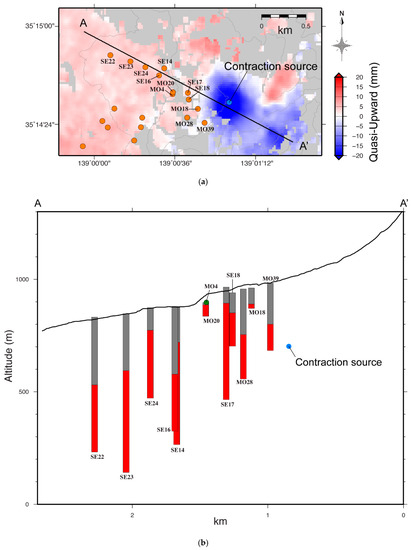 Characteristics of the hot spring wells to the west of Owakudani as (a) a horizontal distribution of hot spring wells (orange-colored points) on the map of quasi-upward velocity; (b) cross-section indicated by A-A’ in (a). Contour lines in (a), in which intervals are 100 m, were extracted from 10 m mesh height data released by the GSI. MO (Motohakone) and SE (Sengokuhara) indicate the numbers of hot spring wells managed by the Odawara Health and Welfare Office. Gray and red colors in (b) show the extent of cased and uncased parts of the borehole, respectively. MO4 is a natural hot spring at the surface.