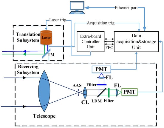 In the receiver subsystem, the telescope receives the returning signals reflected by targets and then focuses them on the rear focal plane. An adjustable aperture stop (AAS) is set at the rear focal plane of the receiving telescope and is driven by a stepping motor. The size of the aperture stop can be adjusted according to the received signal, thus affecting the signal reception of the subsequent optical path. While passing through the AAS and the first collimating lens (CL), the returning signals are separated into a 486 nm laser component and a 532 nm laser component by an LDM. During this process, the 486 nm laser beam is reflected to the 486 nm receiving channel by the LDM, and the 532 nm laser beam is simultaneously reflected into the 532 nm receiving channel by the LDM. Finally, the 532 nm and 486 nm signals pass their respective filters and are focused by a focusing lens onto the photosensitive surfaces of the photomultiplier tube (PMT) detectors.