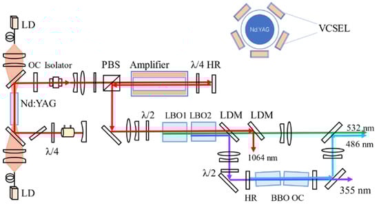 The overall technical route was designed as follows: First, two beams from 808 nm LD pumping sources are coupled into an optical oscillator via optical fibers to pump an Nd:YAG crystal at two ends in order to generate a 1064 nm seed pulse. The KD*P crystal acts as a Q-switch driven by a 100 Hz Q-switched signal. The 1064 nm seed pulse then enters the optical amplifier. The amplifier consists of a polarization beam splitter (PBS), an Nd:YAG crystal, a plate and a total reflection mirror. The seed pulse is amplified in the optical amplifier with a side-pumped VCSEL to achieve two-way amplification. After amplification, the 1064 nm laser beam is shrunk by a condenser and then enters a doubled-frequency crystal, LBO1. After the light passes through the double-frequency crystal, the 532 nm laser is generated. The 532 nm laser beam is then outputted after a long-pass dichroic mirror (LDM). The remaining 1064 nm laser and part of 532 nm laser beam undergo a sum frequency process through an LBO2 crystal to generate a 355 nm laser beam. The 355 nm laser beam is used in the OPO cavity to generate a 486 nm laser beam through an OPO process. The OPO cavity consists of a high reflection mirror, an output coupler and two BBO crystals, which act as OPO crystals. After the OPO process, the 486 nm laser beam is generated. Ultimately, the 486 nm laser beam is combined with the 532 nm laser beam to be outputted.