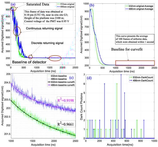 (a) Data for a single frame acquired by the acquisition board. Data obtained near in situ site G3, for a photomultiplier tube (PMT) control voltage of 0.95-V and a plane height of 2100 m; (b) average result for 100 frames of data acquired within 1 s near G3. Data acquired after 1000 ns were used as a curve-fit for the detector system baseline; (c) curve-fit results for the baselines of 532- and 486-nm channels. R-square values for 532- and 486 nm channels are 0.9661 and 0.9198, respectively; (d) dark count statistics for 532 and 486 nm channels, which were obtained without the laser.
