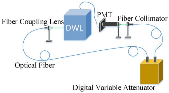 When the returning signal arrives at the photosensitive surface of the PMT, the PMT photocathode generates a series of photoelectrons, which are amplified after passing through several dynodes. Subsequently, when the photoelectrons arrive at the anode, the PMT detector outputs a corresponding current level, and after passing through the corresponding resistors in the following amplification circuit, the output current is then converted into a corresponding voltage value. The amplified voltage value is converted to a digitized value by a 10-bit analog-to-digital converter (ADC). For our DWOL system, the relationship between the analog value and the digitized value can be expressed as: