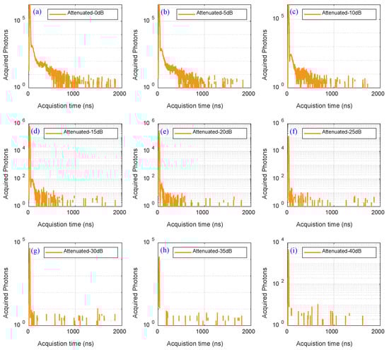 The different attenuation from 0 dB to −40 dB shown in Figure 6 are obtained via the digital variable attenuator shown in Figure 5. From the results shown in Figure 6, we can see that when the intensity of the received signal is lower than −30 dB, the APC effect becomes negligible. In these results, the 0 dB results correspond to the APC effects generated by the returning signal from the water surface shown in Figure 4a. With the distribution of APC measured via the APCCS, the APC photons contained in bin i can be revised.