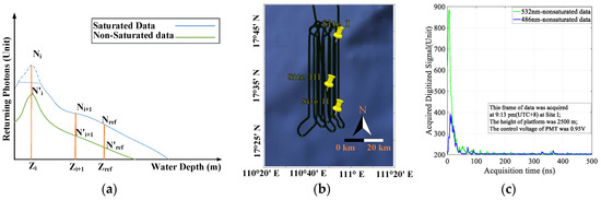 As shown in Figure 4a, the acquired signal was saturated due to strong reflection from the water surface. Moreover, the APC photons caused by the saturated data are not precisely predicted if the actual number of received photons in the saturated area is unknown. For this case, we proposed a new non-saturated value reference (NSVR) method to obtain the weight of saturated photons from the saturation area relative to a reference depth. A diagram of NSVR method is presented in Figure 7a.