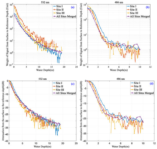 (a) Change in weight with water depth for 532 nm, relative to the reference depth; (b) change in weight with water depth for 486 nm relative to the reference depth; (c) attenuation of weight from the surface to the reference depth for the 532 nm channel; (d) attenuation of weight from the surface to the reference depth for the 486 nm channel.