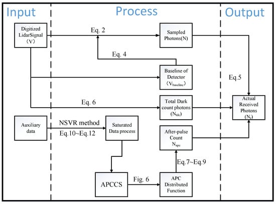 Step 4: The dark count photons of the detectors and the background photons are calculated as the total dark count (TDC) photons, then the actual received photons can be obtained by removing the APC photons and the TDC photons.