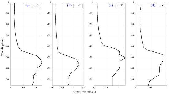 Chlorophyll concentration at G1, G2, B3 and C2, measured in the shipborne experiment using the RBR XR-420. (a) chlorophyll concentration at G1; (b) chlorophyll concentration at G2; (c) chlorophyll concentration at B3; (d) chlorophyll concentration at C2.