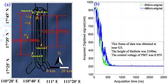 Considering that the laser repetition rate is 100 Hz, and the flight speed is approximately 50 m/s, we accumulated 500 frames of original data into a single frame to expand the dynamic range of the result. These 500 frames of data were obtained within 5 s. The accumulated results are shown in Figure 14a, where the X- and Y-axis values were converted to the water depth and the corresponding number of received photons, according to Equations (1) and (2).