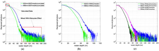 As shown in Figure 14a, the received photons were mixed with the pseudo-photons generated by the after-pulse effect of the previously received photons. Following the calibration algorithm illustrated in Figure 10, the received photons were revised, as shown in Figure 14b. This figure shows that the APC photons primarily affect the results beyond 80 m for 486 nm channel and beyond 60 m for 532 nm channel. The revised water column profiles reached approximately 100 and approximately 80 m for 486 and 532 nm channels, respectively.