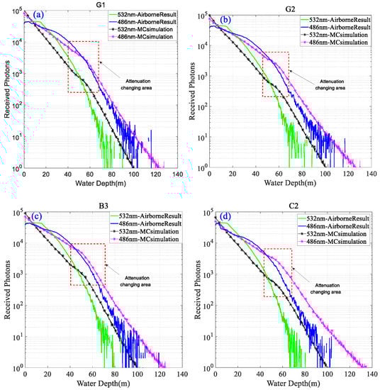 The results show that the attenuation trend and the attenuation changing area of the airborne and the simulation results are highly consistent near in situ sites of G1, G2 and B3. The difference between the airborne results and simulation results may be caused by the different times of the shipborne and the airborne experiments, the errors in the absorption coefficient a and the scattering coefficient b converted with the bio-optical equation, calibration errors in the efficiency of the DWOL system, and the fatigue effect of the PMT detectors after a strong signal pulse. The difference appears to be larger at C2 because the chlorophyll concentration measured by the shipborne experiment was lower at that time; thus, the different dates may be responsible for the chlorophyll concentration difference in the airborne experiment.