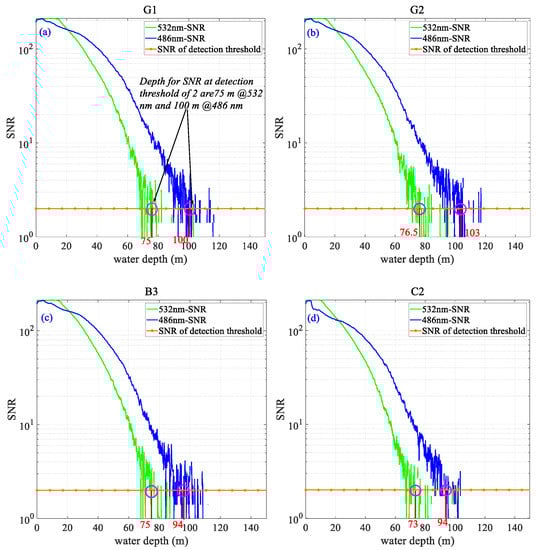 where is the received signal photons count, is the dark count photons acquired by the ADC and is the background photons. According to Equation (15), the values of SNR for 486 and 532 nm channels at G1, G2, B3 and C2 are shown in Figure 16.