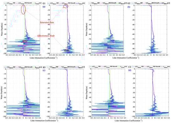 Distribution of lidar attenuation from G1 to C2. (a) Distribution of lidar attenuation at G1; (b) Distribution of lidar attenuation at G2; (c) Distribution of lidar attenuation at B3; (d) Distribution of lidar attenuation at C2; To enhance the stability of the inverted results, the range-corrected returning signals were smoothed by applying a moving average with a 41-ns span. The magenta curves were obtained by a secondary smoothing of the inverse results using the Savity–Golay method with a 51-ns span.