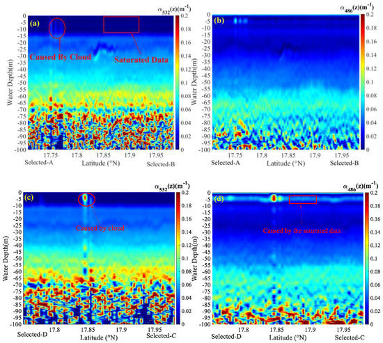 Considering that it is impossible for the lidar attenuation to be lower than the absorption coefficient of pure water; thus, we take the pure water absorption coefficient for 532- and 486 nm laser [33] as the criterion of the effectiveness for their corresponding inversion results, respectively. The results are shown in Figure 17. Figure 17a shows that, the effectiveness of reached near a depth of 75 m; while, the effectiveness of extended to a depth of approximately 93.m, which was about 24% deeper than that of 532 nm channel. From Figure 17, we can see that the effectiveness of profiles of was not deeper than 80 m. By contrast, the effectiveness of profiles for reached a depth of approximately 100 m. Moreover, the values of tended to be smaller after a depth of 80 m, indicating that the chlorophyll concentration became less beyond 80 m, which was in agreement with the shipborne results.