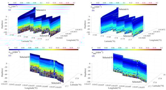 To illustrate the spatial change of lidar attenuation distribution along the flight track, we inverted the airborne data from Selected-A to Selected-B and Selected-C to Selected-D, as shown in Figure 13. The inverted results are shown in Figure 18.