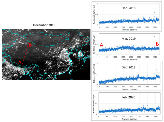 During the first half of 2020, the world experienced economic collapse due to the COVID-19 pandemic since the Great Depression in the late 1920s [1]. It is well established that low-light imaging satellite sensors are able to detect the dimming and loss of lighting after disaster events [2,3,4], wars [5,6], and economic collapse [7]. In order to explore the possibility that satellite observation can be used to track the decline and recovery of economic activity worldwide associated with the COVID-19 pandemic, we conducted an analysis of lighting changes in China, the first country that experienced the pandemic. Large portions of the Chinese economy shut down, as the government imposed a national lockdown forcing most people to remain at home [8]. Previous satellite studies indicate that the nighttime lights of China have been growing for several decades [9]. For this study, we use specialized low-light imaging satellite data collected by the NASA/NOAA Visible Infrared Imaging Radiometer Suite (VIIRS) day-night band (DNB). The DNB light intensification was designed to detect moonlit clouds in the visible band [10]. With a million-fold amplification in the signal, the DNB also detects electric lighting present at the Earth’s surface.