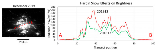 Radiance transect across Harbin, China showing the brightening effect of snow cover present in December 2019. The December 2018 radiances were consistently dimmer than the December 2019 ones.